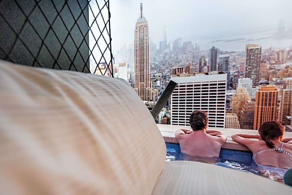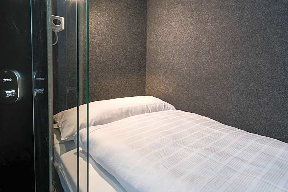 This air-conditioned sleeping box features 1 large single bed (47 in wide) on the upper level and 1 single bed (31 in wide) on the lower level. It also offers a sink.